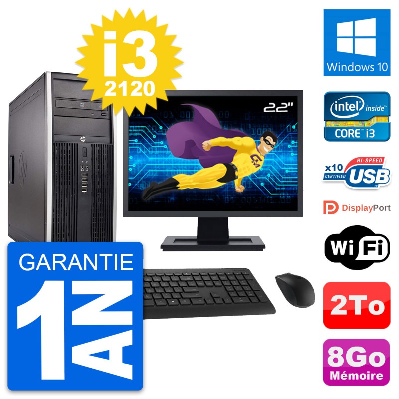 PC Tour HP 8300 Elite - Intel Core i3-2120 3.3 Ghz (3 Mo) - 8 Go DDR3 - Disque Dur 3,5" 2 To - Graveur DVD - Clef Wifi USB - Windows 10 - Livré avec Ecran 22" + clavier + souris (Marques et modèles variables) - Garantie 1 an.