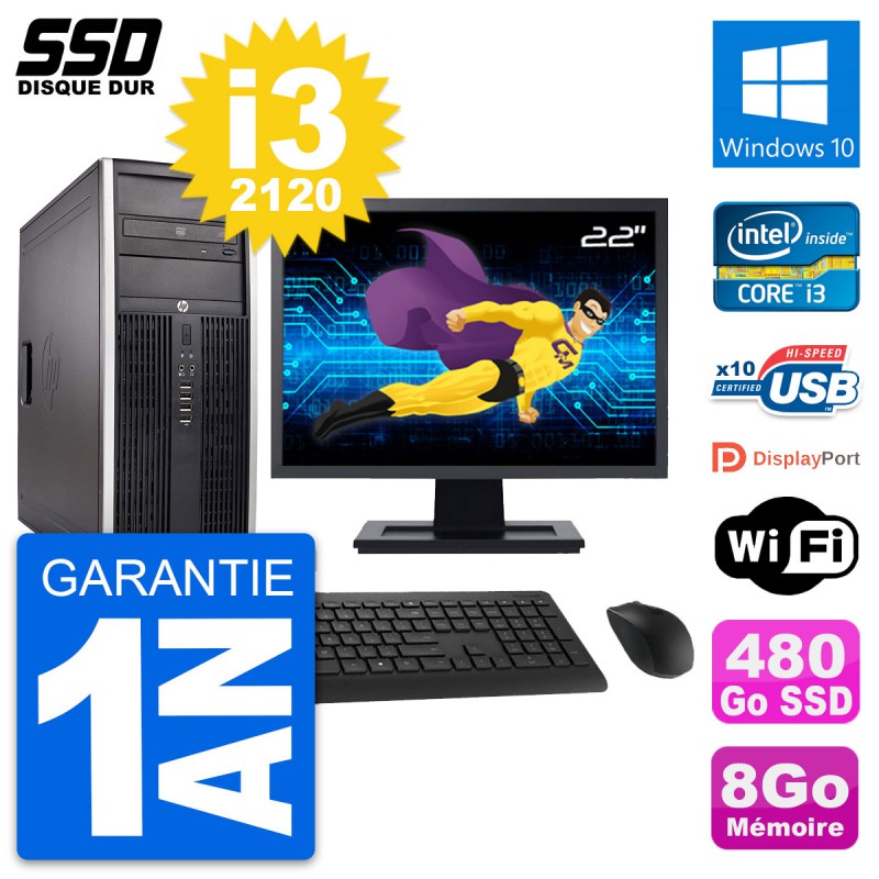 PC Tour HP Elite 8300 Ecran 22" Intel i3-2120 RAM 8Go SSD 480Go Windows 10 Wifi