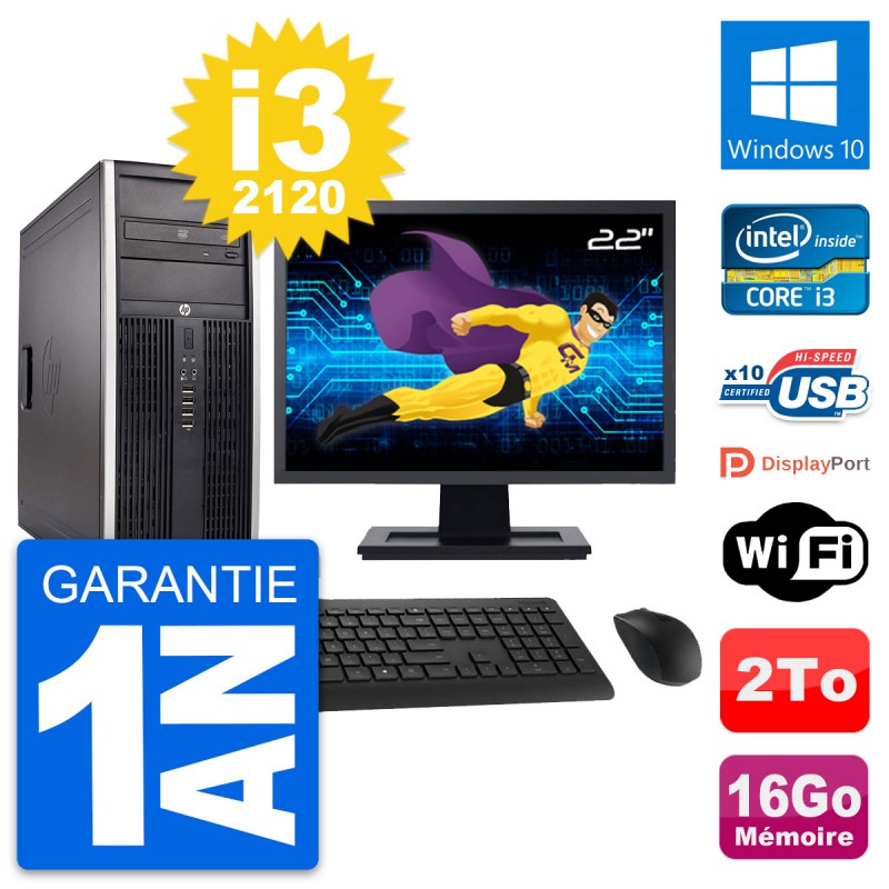 PC Tour HP 8300 Elite - Intel Core i3-2120 3.3 Ghz (3 Mo) - 16 Go DDR3 - Disque Dur 3,5" 2 To - Graveur DVD - Clef Wifi USB - Windows 10 - Livré avec Ecran 22" + clavier + souris (Marques et modèles variables) - Garantie 1 an.