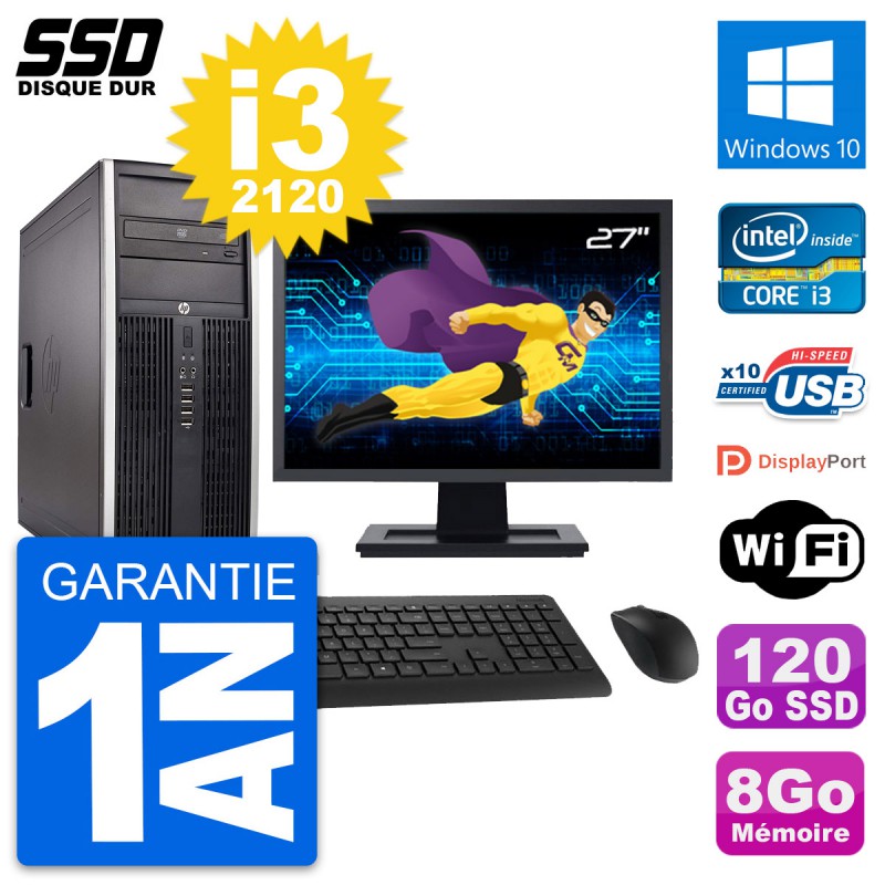 PC Tour HP Elite 8300 Ecran 27" Intel i3-2120 RAM 8Go SSD 120Go Windows 10 Wifi