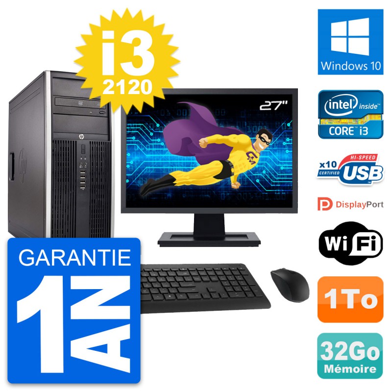 PC Tour HP 8300 Elite - Intel Core i3-2120 3.3 Ghz (3 Mo) - 32 Go DDR3 - Disque Dur 3,5" 1 To - Graveur DVD - Clef Wifi USB - Windows 10 - Livré avec Ecran 27" + clavier + souris (Marques et modèles variables) - Garantie 1 an.