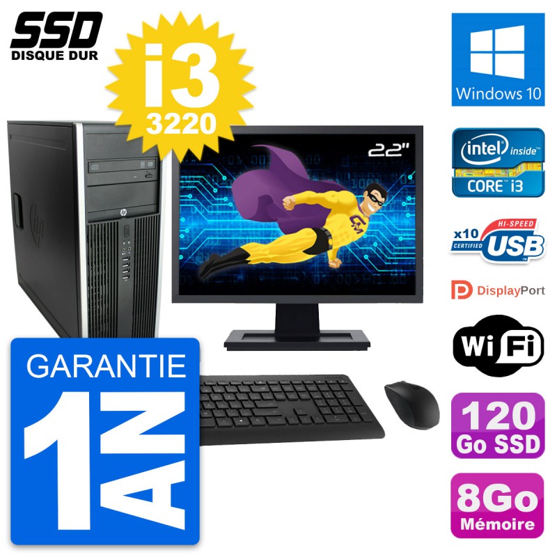 PC Tour HP Elite 8300 Ecran 22" Intel i3-3220 RAM 8Go SSD 120Go Windows 10 Wifi