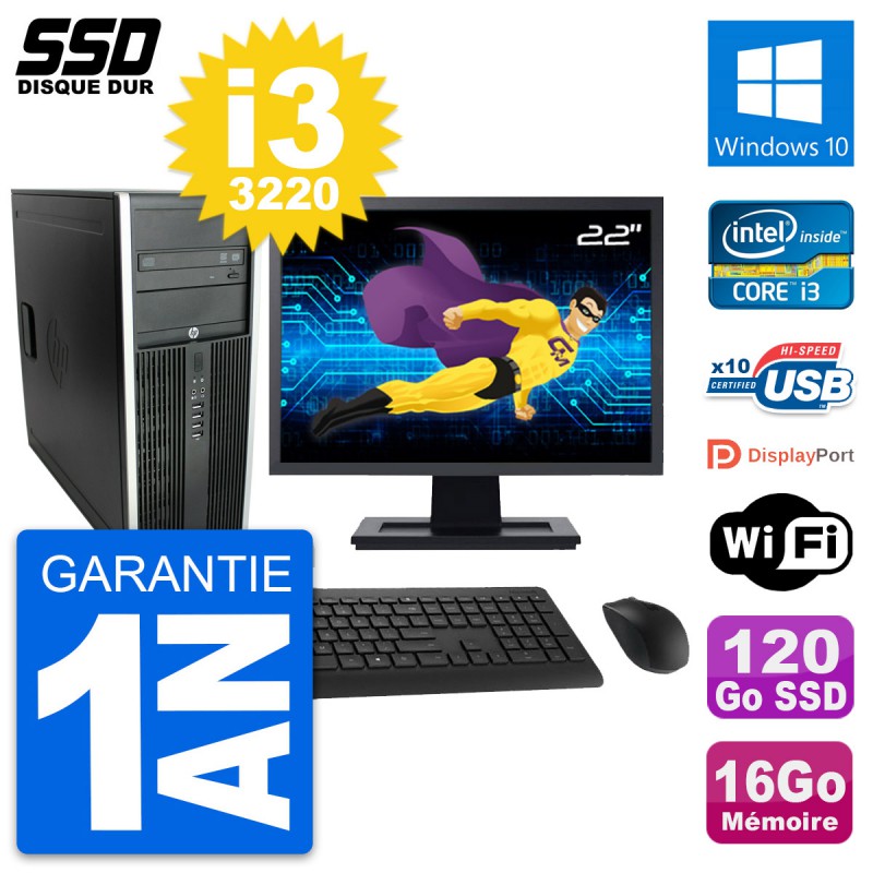 PC Tour HP Elite 8300 Ecran 22" Intel i3-3220 RAM 16Go SSD 120Go Windows 10 Wifi