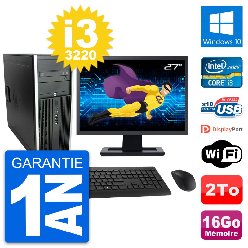 PC Tour HP 8300 Elite - Intel Core i3-3220 3.3 Ghz (3 Mo) - 16 Go DDR3 - Disque Dur 3,5" 2 To - Graveur DVD - Clef Wifi USB - Windows 10 - Livré avec Ecran 27" + clavier + souris (Marques et modèles variables) - Garantie 1 an.