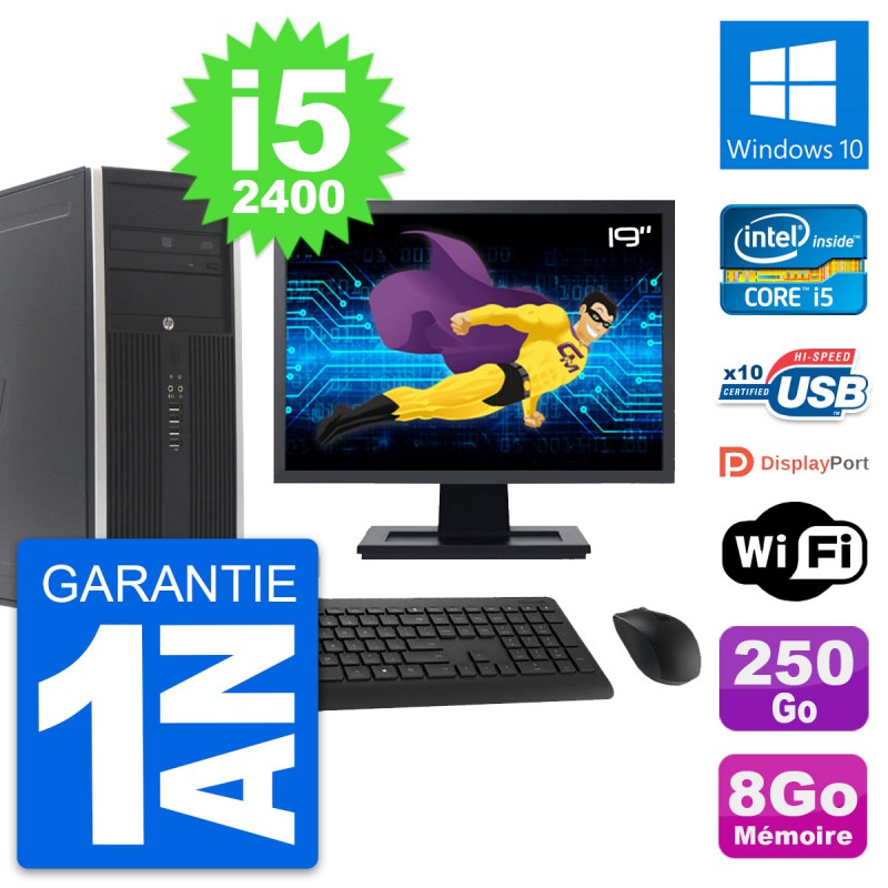 PC Tour HP 8300 Elite - Intel Core i5-2400 3.1 Ghz (6 Mo) - 8 Go DDR3 - Disque Dur 3,5" 250 Go - Graveur DVD - Clef Wifi USB - Windows 10 - Livré avec Ecran 19" + clavier + souris (Marques et modèles variables) - Garantie 1 an.