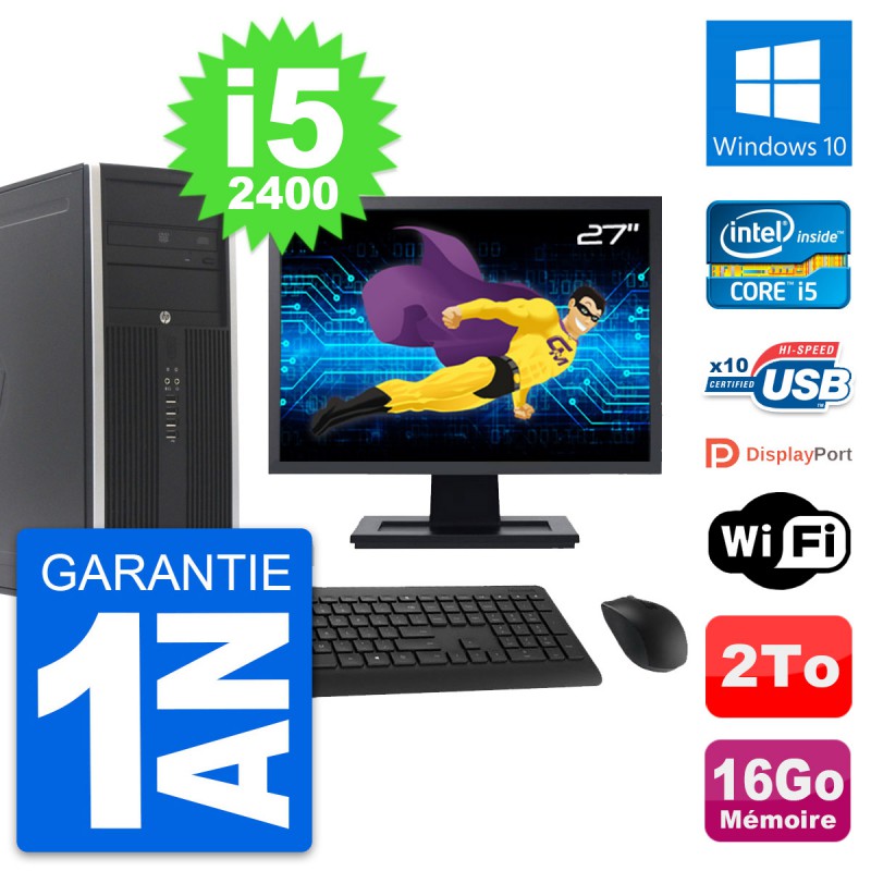 PC Tour HP 8300 Elite - Intel Core i5-2400 3.1 Ghz (6 Mo) - 16 Go DDR3 - Disque Dur 3,5" 2 To - Graveur DVD - Clef Wifi USB - Windows 10 - Livré avec Ecran 27" + clavier + souris (Marques et modèles variables) - Garantie 1 an.