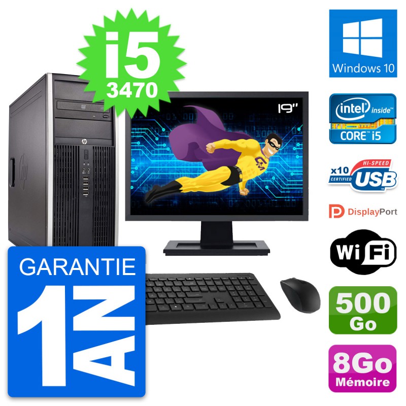 PC Tour HP 8300 Elite - Intel Core i5-3470 3.2 Ghz (6 Mo) - 8 Go DDR3 - Disque Dur 3,5" 500 Go - Graveur DVD - Clef Wifi USB - Windows 10 - Livré avec Ecran 19" + clavier + souris (Marques et modèles variables) - Garantie 1 an.