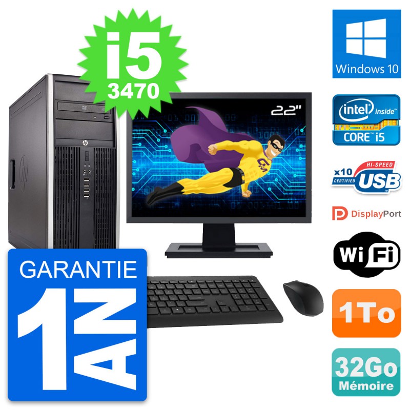 PC Tour HP 8300 Elite - Intel Core i5-3470 3.2 Ghz (6 Mo) - 32 Go DDR3 - Disque Dur 3,5" 1 To - Graveur DVD - Clef Wifi USB - Windows 10 - Livré avec Ecran 22" + clavier + souris (Marques et modèles variables) - Garantie 1 an.