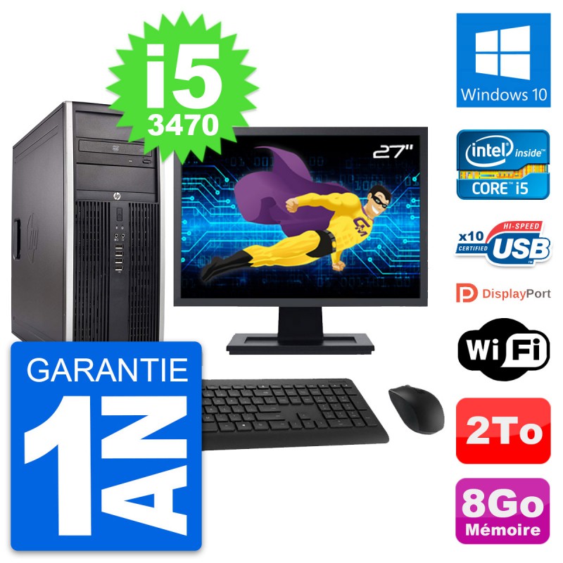 PC Tour HP 8300 Elite - Intel Core i5-3470 3.2 Ghz (6 Mo) - 8 Go DDR3 - Disque Dur 3,5" 2 To - Graveur DVD - Clef Wifi USB - Windows 10 - Livré avec Ecran 27" + clavier + souris (Marques et modèles variables) - Garantie 1 an.