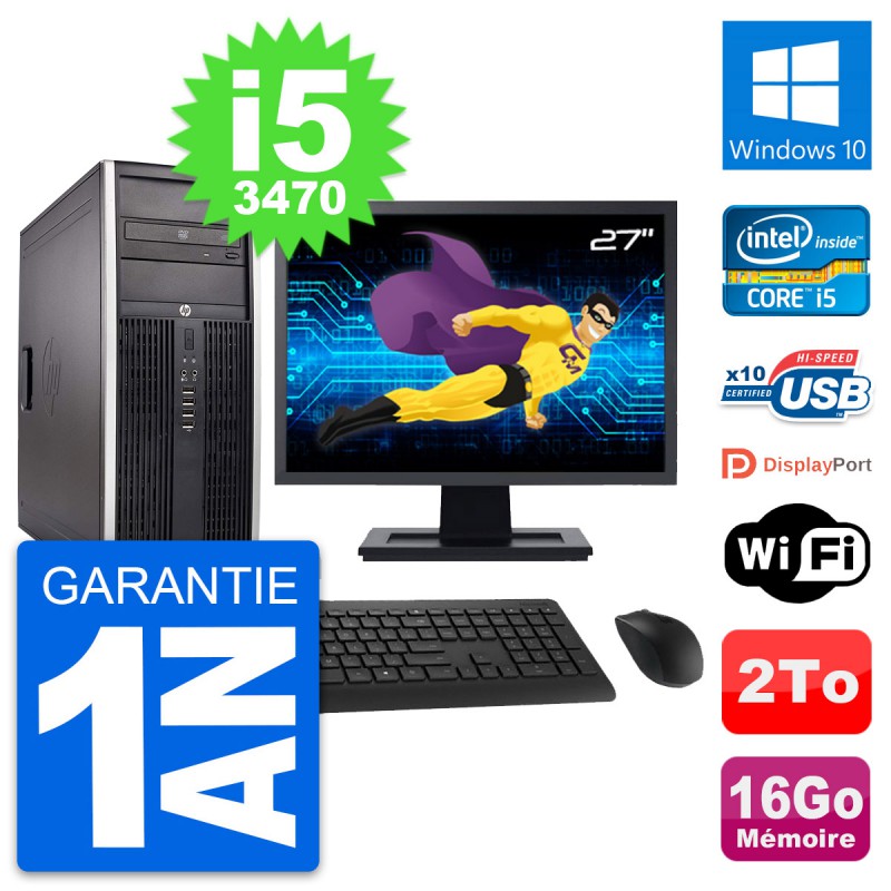 PC Tour HP 8300 Elite - Intel Core i5-3470 3.2 Ghz (6 Mo) - 16 Go DDR3 - Disque Dur 3,5" 2 To - Graveur DVD - Clef Wifi USB - Windows 10 - Livré avec Ecran 27" + clavier + souris (Marques et modèles variables) - Garantie 1 an.