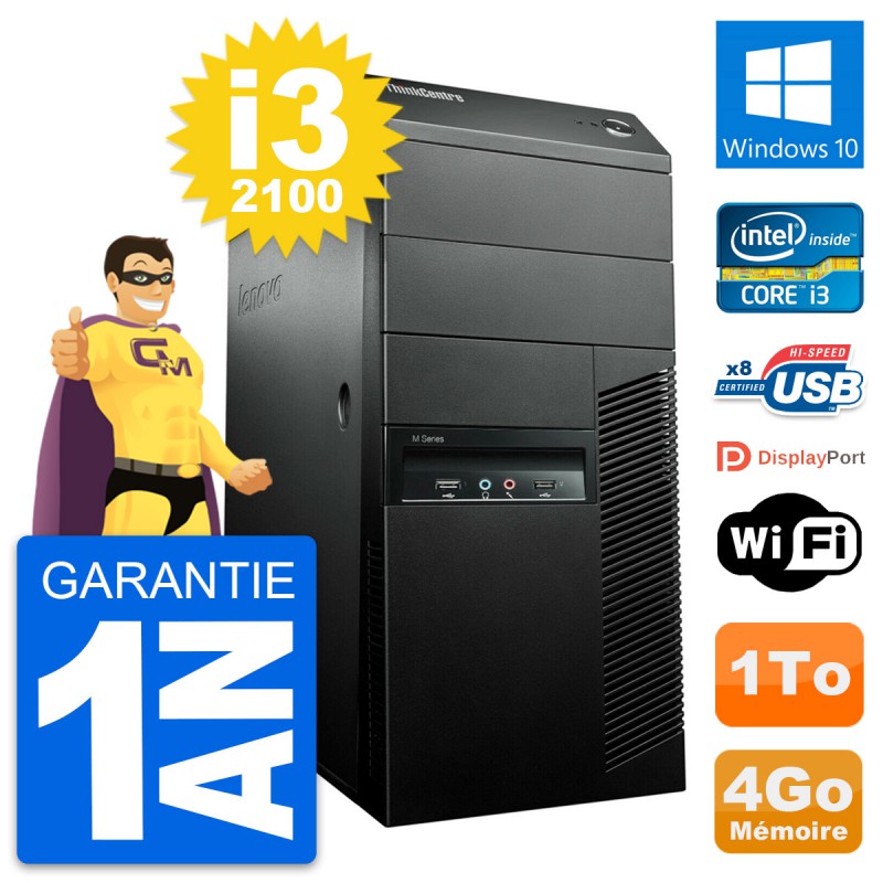 PC Tour Lenovo ThinkCentre M91p - Intel Core i3-2120 3.1 Ghz (3 Mo) - 4 Go DDR3 - Disque Dur 3,5" 1 To - Clef Wifi USB - Windows 10 - Garantie 1 an.