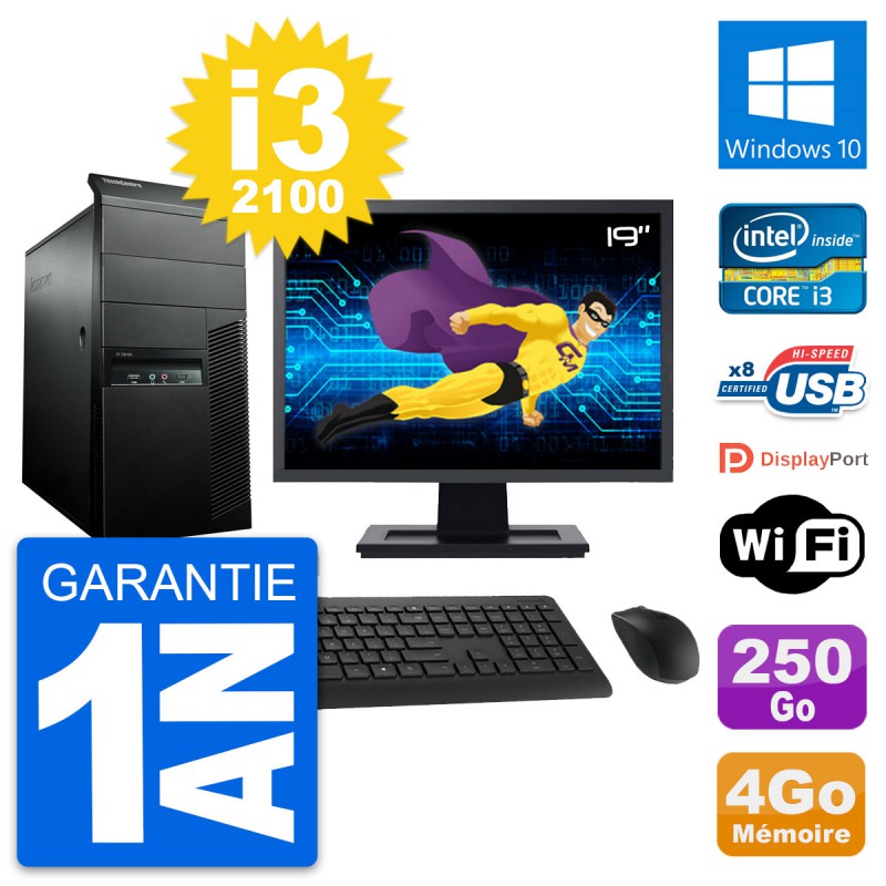 PC Tour Lenovo M91p Ecran 19" Intel i3-2100 RAM 4Go Disque 250Go Windows 10 Wifi