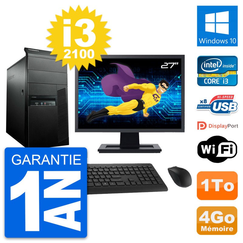 PC Tour Lenovo M91p Ecran 27" Core i3-2100 RAM 4Go Disque 1To Windows 10 Wifi
