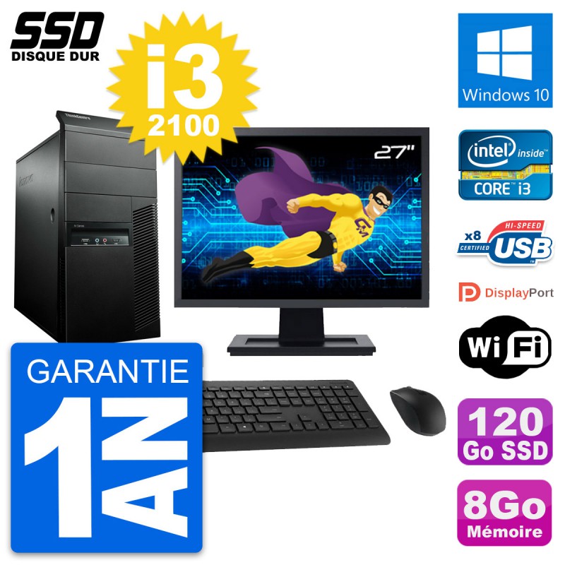 PC Tour Lenovo ThinkCentre M91p - Intel Core i3-2120 3.1 Ghz (3 Mo) - 8 Go DDR3 - Disque Dur SSD 120 Go - Clef Wifi USB - Windows 10 - Livré avec Ecran 27" + clavier + souris (Marques et modèles variables) - Garantie 1 an.