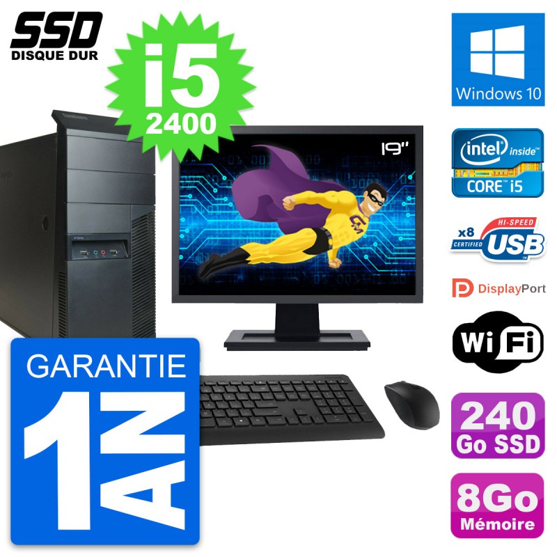 PC Tour Lenovo ThinkCentre M91p - Intel Core i5-2400 3.1 Ghz (6 Mo) - 8 Go DDR3 - Disque Dur SSD 240 Go - Clef Wifi USB - Windows 10 - Livré avec Ecran 19" + clavier + souris (Marques et modèles variables) - Garantie 1 an.