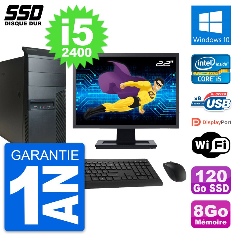 PC Tour Lenovo M91p Ecran 22" Core i5-2400 RAM 8Go SSD 120Go Windows 10 Wifi