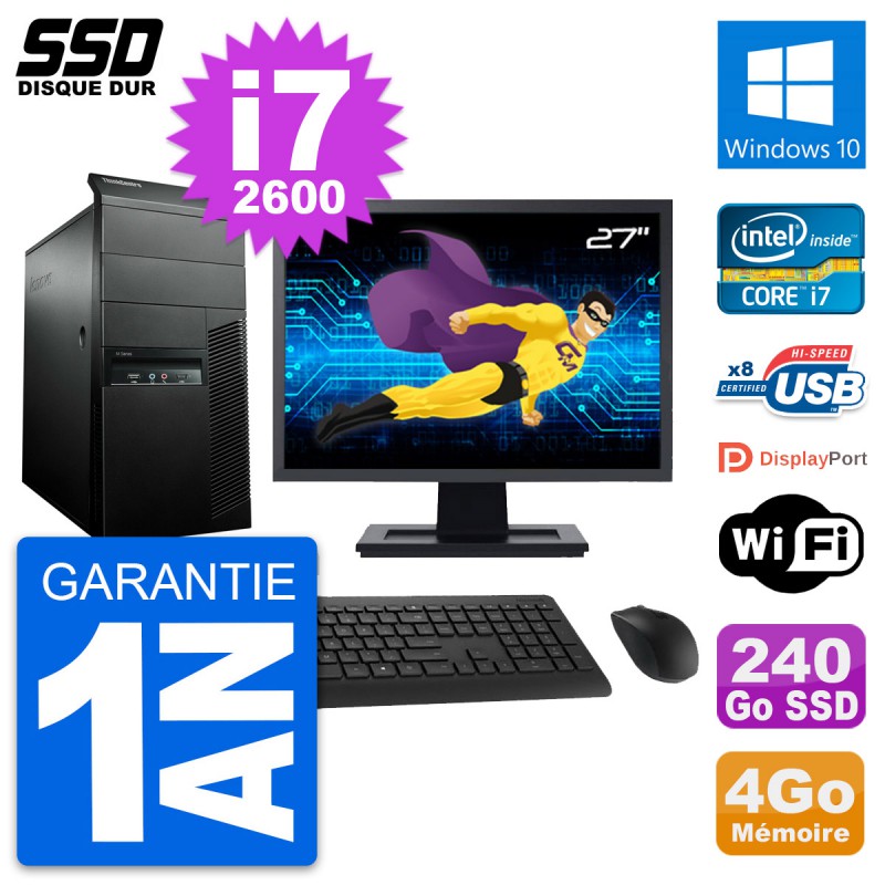 PC Tour Lenovo M91p Ecran 27" Core i7-2600 RAM 4Go SSD 240Go Windows 10 Wifi
