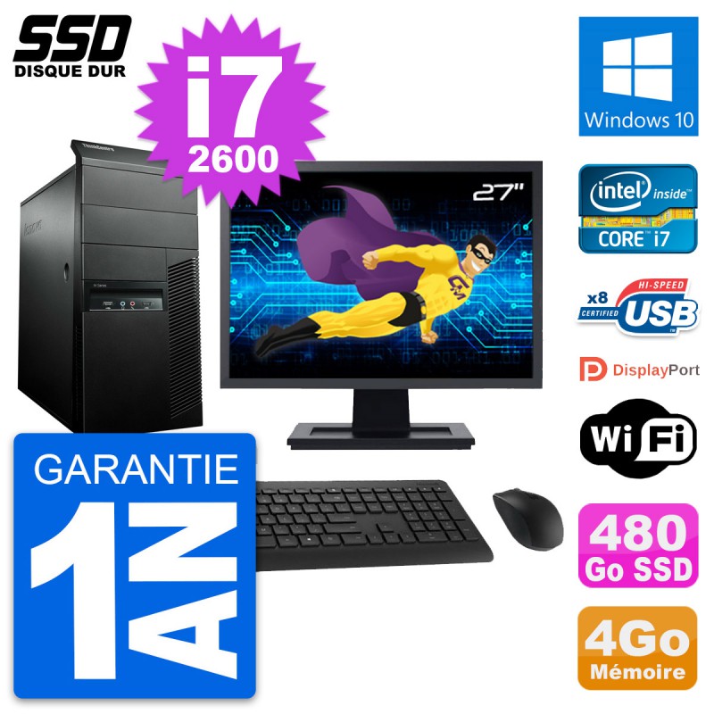 PC Tour Lenovo ThinkCentre M91p - Intel Core i7-2600 3.4 Ghz (8 Mo) - 4 Go DDR3 - Disque Dur SSD 480 Go - Clef Wifi USB - Windows 10 - Livré avec Ecran 27" + clavier + souris (Marques et modèles variables) - Garantie 1 an.