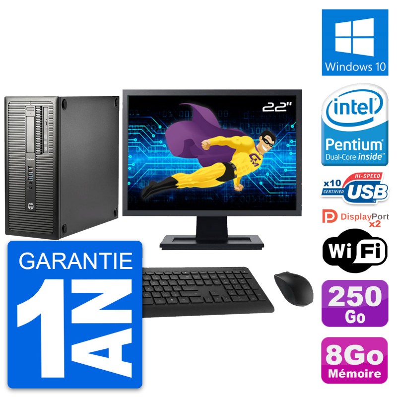 PC Tour HP EliteDesk 800 G1 - Intel Pentium G3220 3.0 Ghz (3 Mo) - 8 Go DDR3 - Disque Dur 3,5" 250 Go - Graveur DVD - Clef Wifi USB - Windows 10 - Livré avec Ecran 22" + clavier + souris (Marques et modèles variables) - Garantie 1 an.