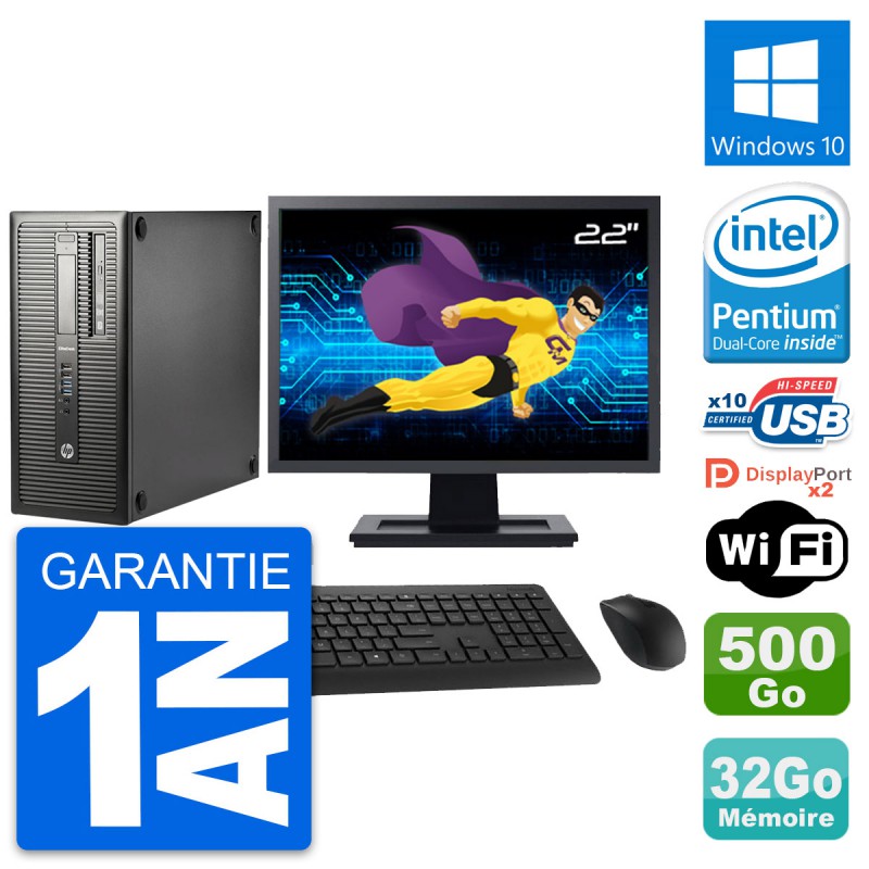 PC Tour HP EliteDesk 800 G1 - Intel Pentium G3220 3.0 Ghz (3 Mo) - 32 Go DDR3 - Disque Dur 3,5" 500 Go - Graveur DVD - Clef Wifi USB - Windows 10 - Livré avec Ecran 22" + clavier + souris (Marques et modèles variables) - Garantie 1 an.