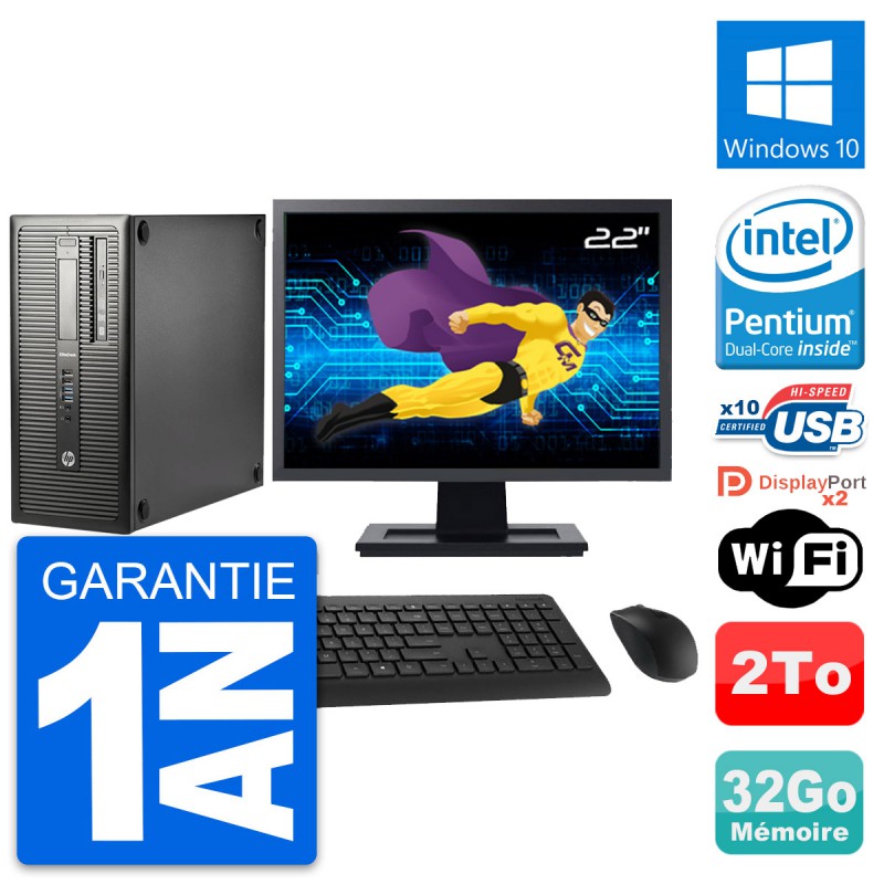 PC Tour HP EliteDesk 800 G1 Ecran 22" G3220 RAM 32Go Disque 2To Windows 10 Wifi