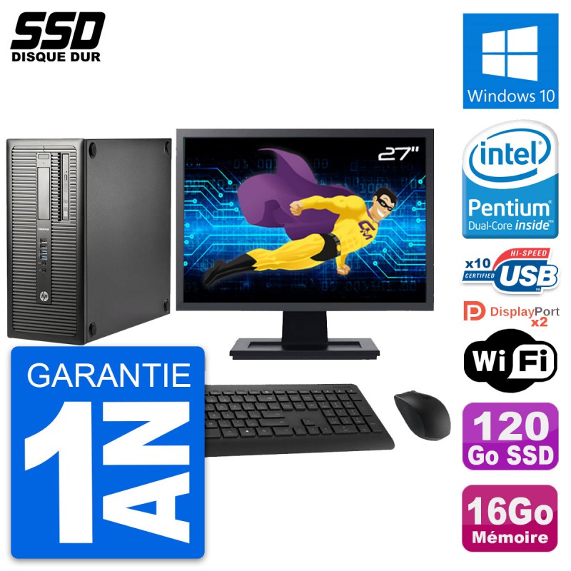 PC Tour HP EliteDesk 800 G1 - Intel Pentium G3220 3.0 Ghz (3 Mo) - 16 Go DDR3 - Disque Dur SSD 120 Go - Graveur DVD - Clef Wifi USB - Windows 10 - Livré avec Ecran 27" + clavier + souris (Marques et modèles variables) - Garantie 1 an.
