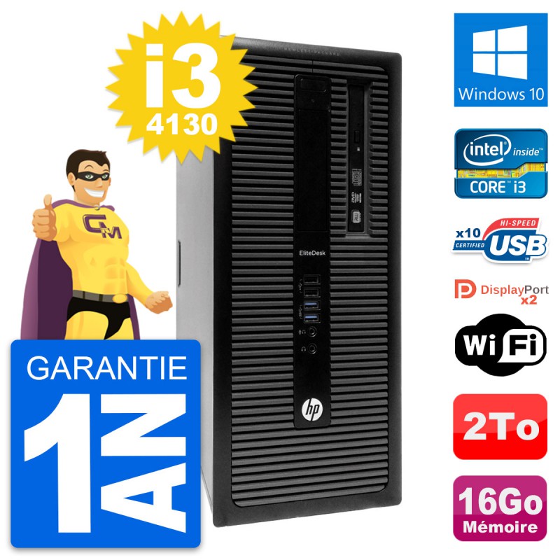 PC Tour HP EliteDesk 800 G1 - Intel Core i3-4130 3.4 Ghz (3 Mo) - 16 Go DDR3 - Disque Dur 3,5" 2 To - Graveur DVD - Clef Wifi USB - Windows 10 - Garantie 1 an.