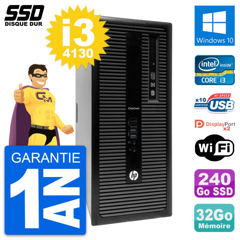 PC Tour HP EliteDesk 800 G1 - Intel Core i3-4130 3.4 Ghz (3 Mo) - 32 Go DDR3 - Disque Dur SSD 240 Go - Graveur DVD - Clef Wifi USB - Windows 10 - Garantie 1 an.