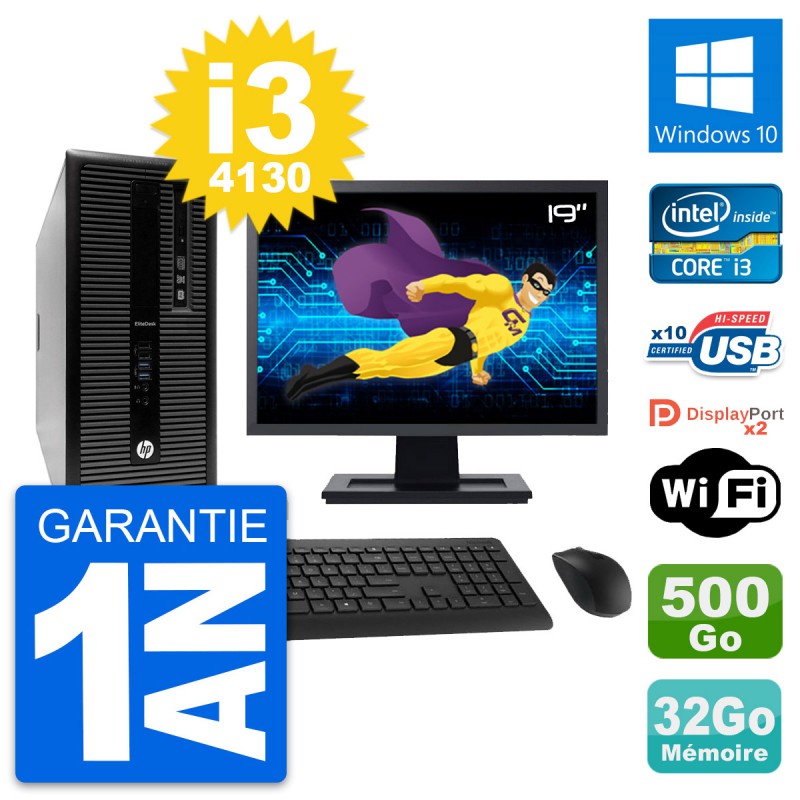 PC Tour HP EliteDesk 800 G1 - Intel Core i3-4130 3.4 Ghz (3 Mo) - 32 Go DDR3 - Disque Dur 3,5" 500 Go - Graveur DVD - Clef Wifi USB - Windows 10 - Livré avec Ecran 19" + clavier + souris (Marques et modèles variables) - Garantie 1 an.