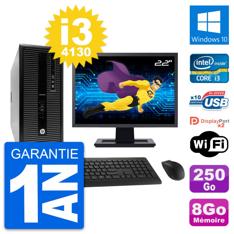 PC Tour HP 800 G1 Ecran 22" Intel i3-4130 RAM 8Go Disque 250Go Windows 10 Wifi