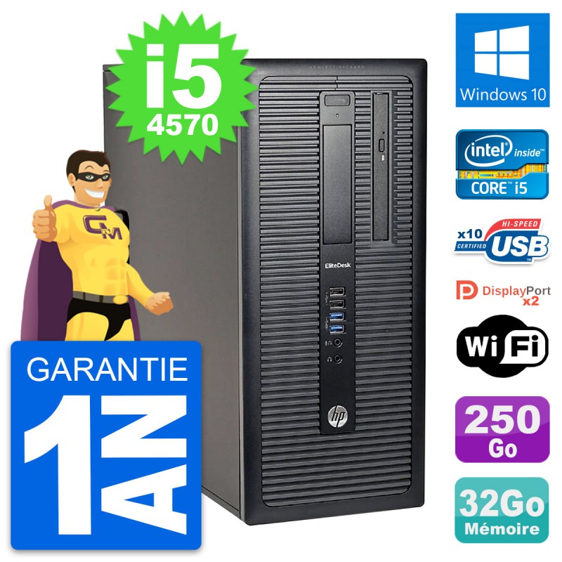 PC Tour HP EliteDesk 800 G1 - Intel Core i5-4570 3.2 Ghz (6 Mo) - 32 Go DDR3 - Disque Dur 3,5" 250 Go - Graveur DVD - Clef Wifi USB - Windows 10 - Garantie 1 an.