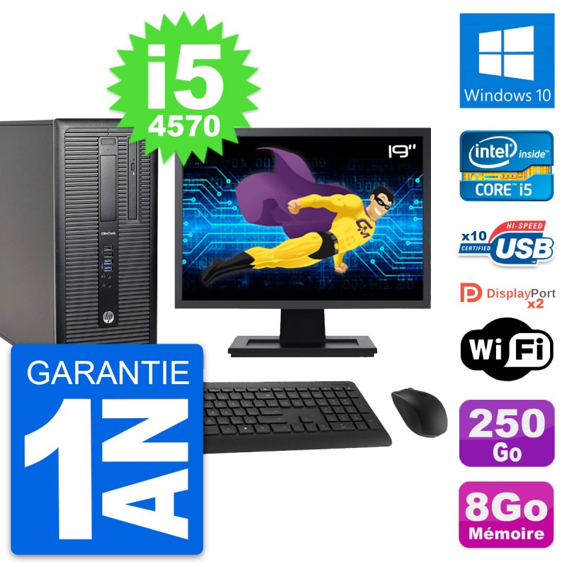 PC Tour HP 800 G1 Ecran 19" Intel i5-4570 RAM 8Go Disque 250Go Windows 10 Wifi