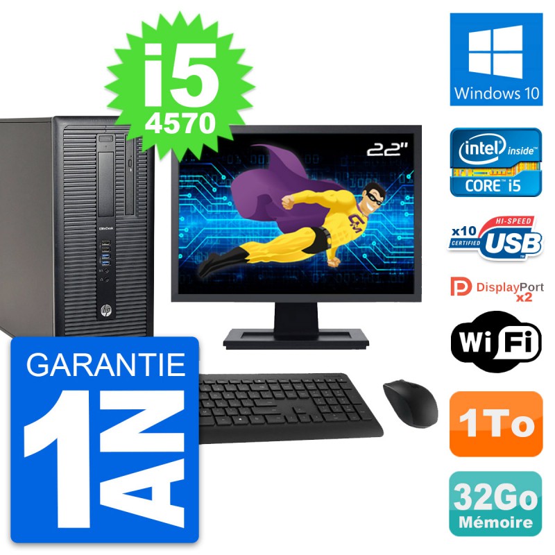 PC Tour HP EliteDesk 800 G1 - Intel Core i5-4570 3.2 Ghz (6 Mo) - 32 Go DDR3 - Disque Dur 3,5" 1 To - Graveur DVD - Clef Wifi USB - Windows 10 - Livré avec Ecran 22" + clavier + souris (Marques et modèles variables) - Garantie 1 an.