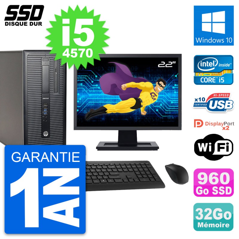 PC Tour HP EliteDesk 800 G1 Ecran 22" i5-4570 RAM 32Go SSD 960Go Windows 10 Wifi