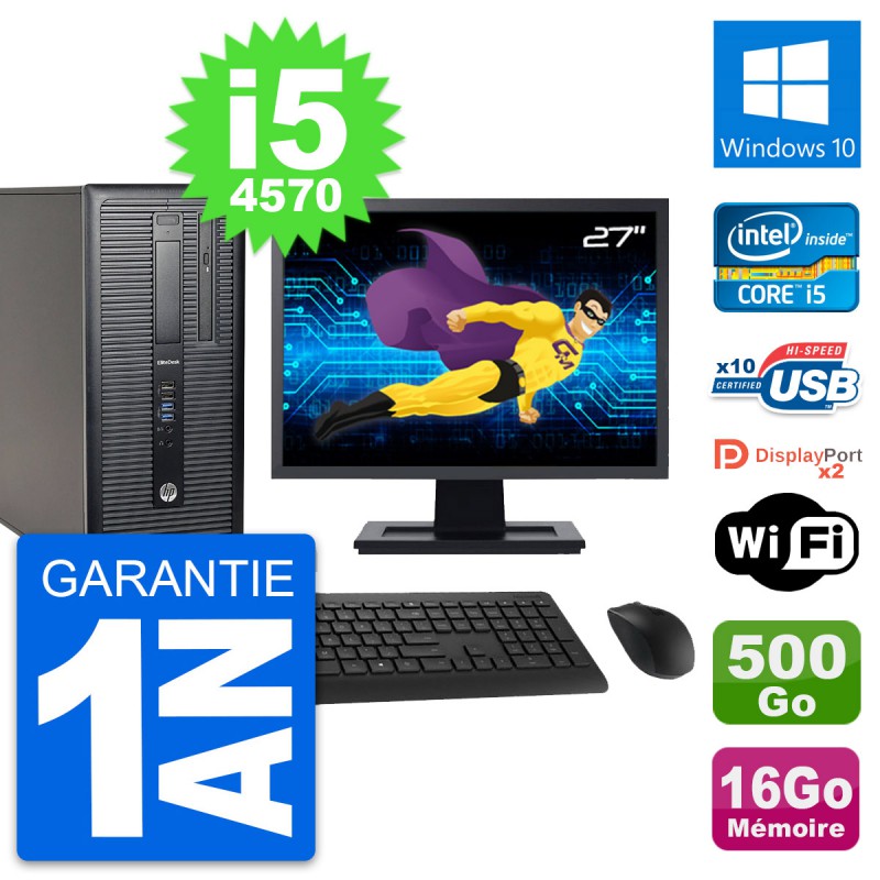 PC Tour HP EliteDesk 800 G1 - Intel Core i5-4570 3.2 Ghz (6 Mo) - 16 Go DDR3 - Disque Dur 3,5" 500 Go - Graveur DVD - Clef Wifi USB - Windows 10 - Livré avec Ecran 27" + clavier + souris (Marques et modèles variables) - Garantie 1 an.