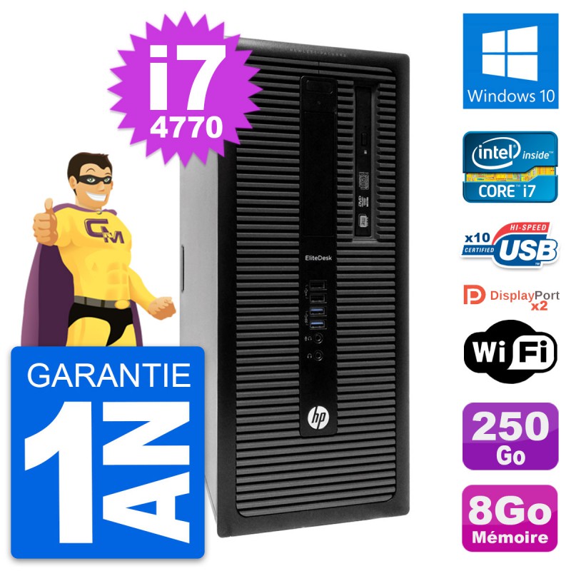 PC Tour HP EliteDesk 800 G1 - Intel Core i7-4770 3.4 Ghz (8 Mo) - 8 Go DDR3 - Disque Dur 3,5" 250 Go - Graveur DVD - Clef Wifi USB - Windows 10 - Garantie 1 an.