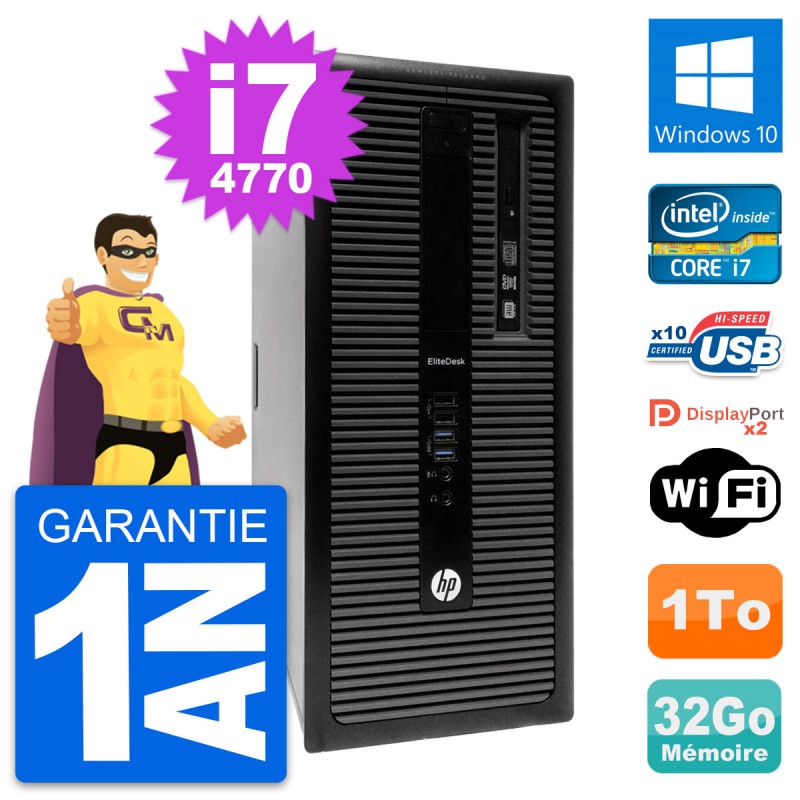 PC Tour HP EliteDesk 800 G1 - Intel Core i7-4770 3.4 Ghz (8 Mo) - 32 Go DDR3 - Disque Dur 3,5" 1 To - Graveur DVD - Clef Wifi USB - Windows 10 - Garantie 1 an.
