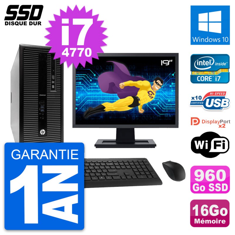 PC Tour HP EliteDesk 800 G1 - Intel Core i7-4770 3.4 Ghz (8 Mo) - 16 Go DDR3 - Disque Dur SSD 960 Go - Graveur DVD - Clef Wifi USB - Windows 10 - Livré avec Ecran 19" + clavier + souris (Marques et modèles variables) - Garantie 1 an.