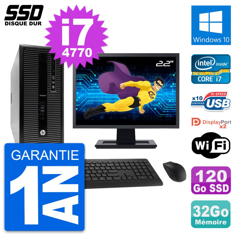 PC Tour HP EliteDesk 800 G1 - Intel Core i7-4770 3.4 Ghz (8 Mo) - 32 Go DDR3 - Disque Dur SSD 120 Go - Graveur DVD - Clef Wifi USB - Windows 10 - Livré avec Ecran 22" + clavier + souris (Marques et modèles variables) - Garantie 1 an.