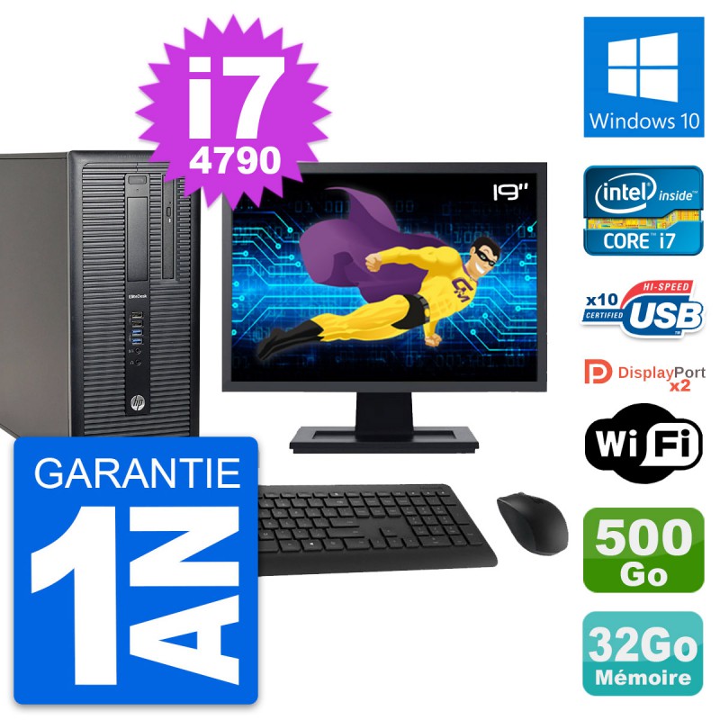 PC Tour HP 800 G1 Ecran 19" Intel i7-4790 RAM 32Go Disque 500Go Windows 10 Wifi