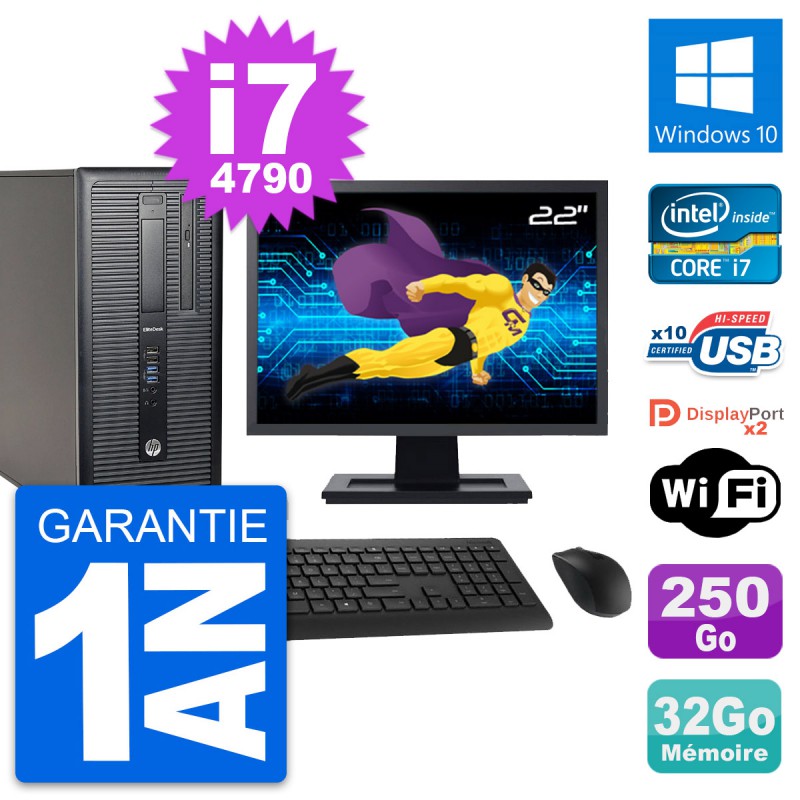 PC Tour HP EliteDesk 800 G1 - Intel Core i7-4790 3.6 Ghz (8 Mo) - 32 Go DDR3 - Disque Dur 3,5" 250 Go - Graveur DVD - Clef Wifi USB - Windows 10 - Livré avec Ecran 22" + clavier + souris (Marques et modèles variables) - Garantie 1 an.