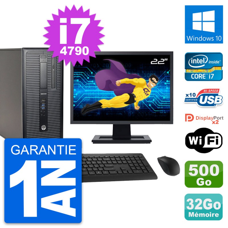 PC Tour HP 800 G1 Ecran 22" Intel i7-4790 RAM 32Go Disque 500Go Windows 10 Wifi