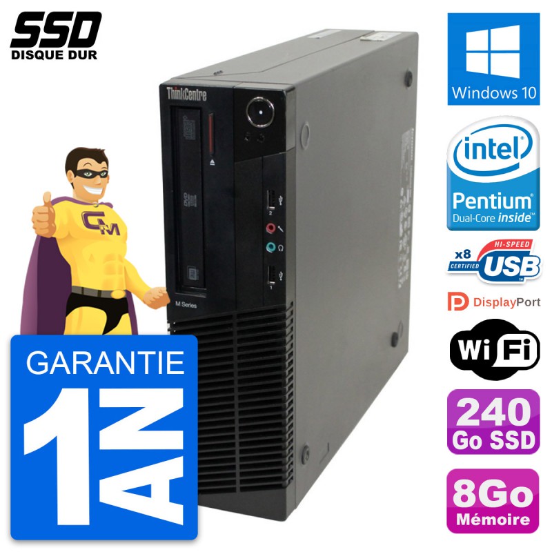 PC Lenovo ThinkCentre M82 SFF - Intel Pentium G630 2.7 Ghz (3 Mo) - 8 Go DDR3 - Disque Dur SSD 240 Go - Graveur DVD - Clef Wifi USB - Windows 10 - Garantie 1 an.