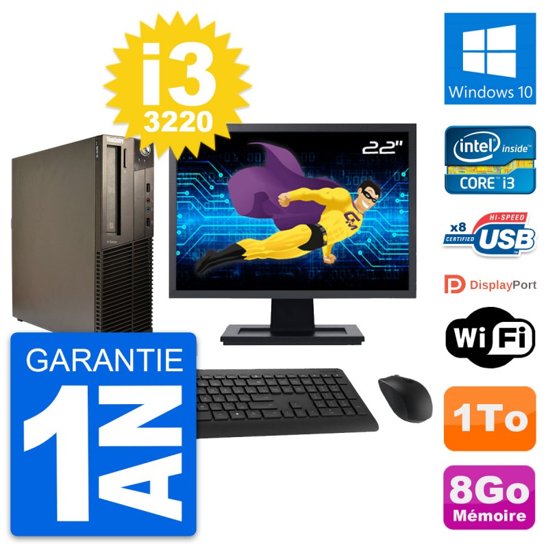 PC Lenovo M82 SFF Ecran 22" Intel i3-3220 RAM 8Go Disque Dur 1To Windows 10 Wifi