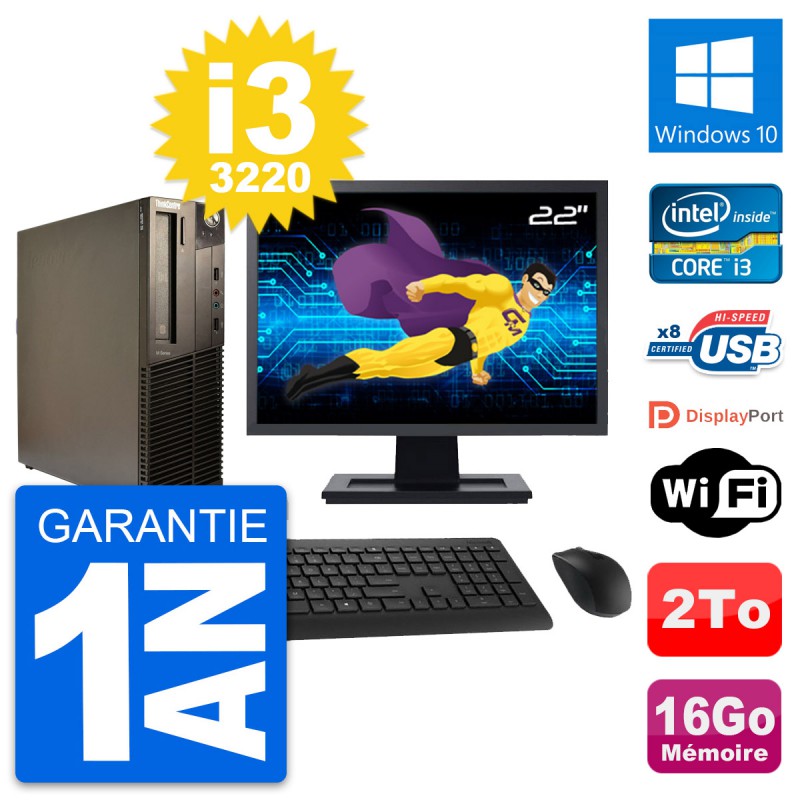 PC Lenovo M82 SFF - Intel Core i3-3220 3.3 Ghz (3 Mo) - 16 Go DDR3 - Disque Dur 3,5" 2 To - Graveur DVD - Clef Wifi USB - Windows 10 - Livré avec Ecran 22" + clavier + souris (Marques et modèles variables) - Garantie 1 an.