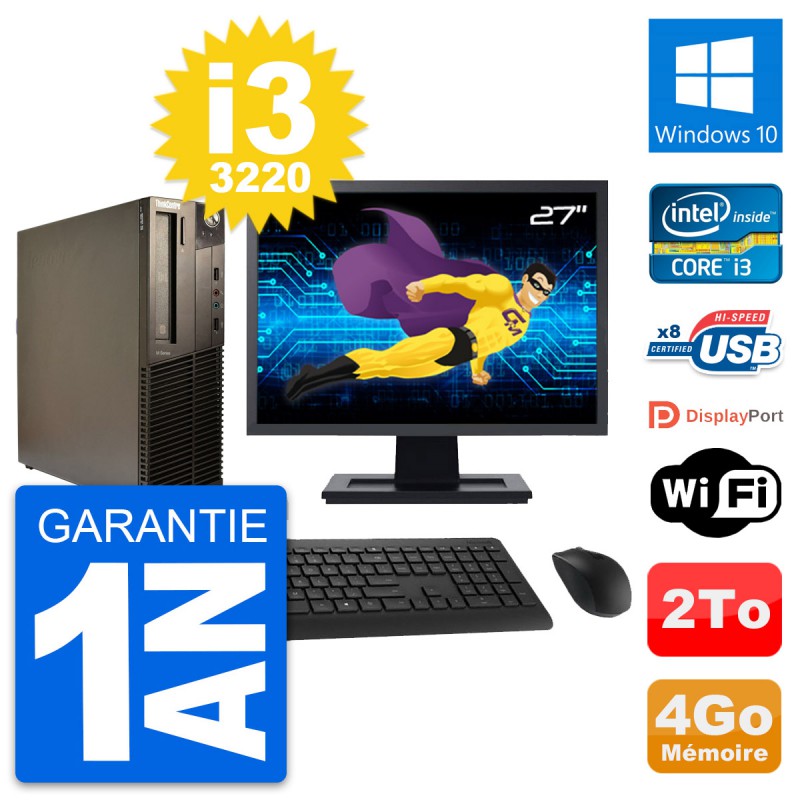 PC Lenovo M82 SFF - Intel Core i3-3220 3.3 Ghz (3 Mo) - 4 Go DDR3 - Disque Dur 3,5" 2 To - Graveur DVD - Clef Wifi USB - Windows 10 - Livré avec Ecran 27" + clavier + souris (Marques et modèles variables) - Garantie 1 an.