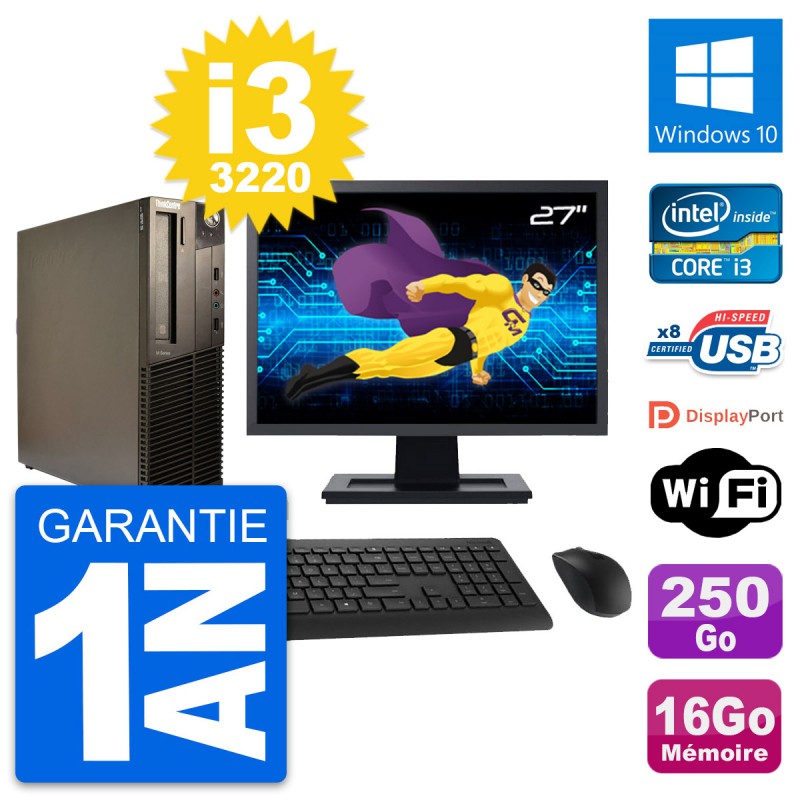 PC Lenovo M82 SFF - Intel Core i3-3220 3.3 Ghz (3 Mo) - 16 Go DDR3 - Disque Dur 3,5" 250 Go - Graveur DVD - Clef Wifi USB - Windows 10 - Livré avec Ecran 27" + clavier + souris (Marques et modèles variables) - Garantie 1 an.