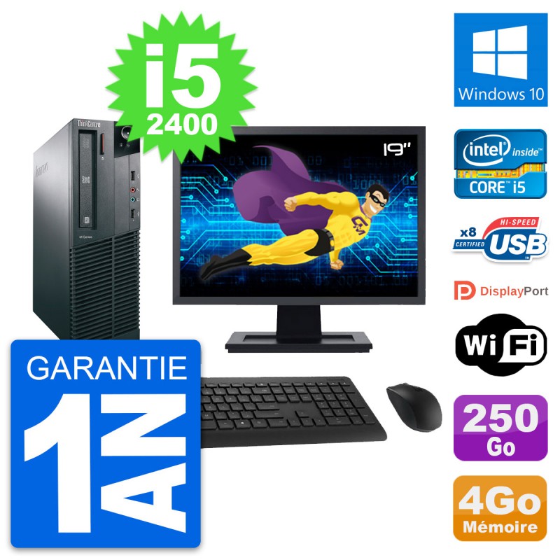PC Lenovo M82 SFF - Intel Core i5-2400 3.1 Ghz (6 Mo) - 4 Go DDR3 - Disque Dur 3,5" 250 Go - Graveur DVD - Clef Wifi USB - Windows 10 - Livré avec Ecran 19" + clavier + souris (Marques et modèles variables) - Garantie 1 an.