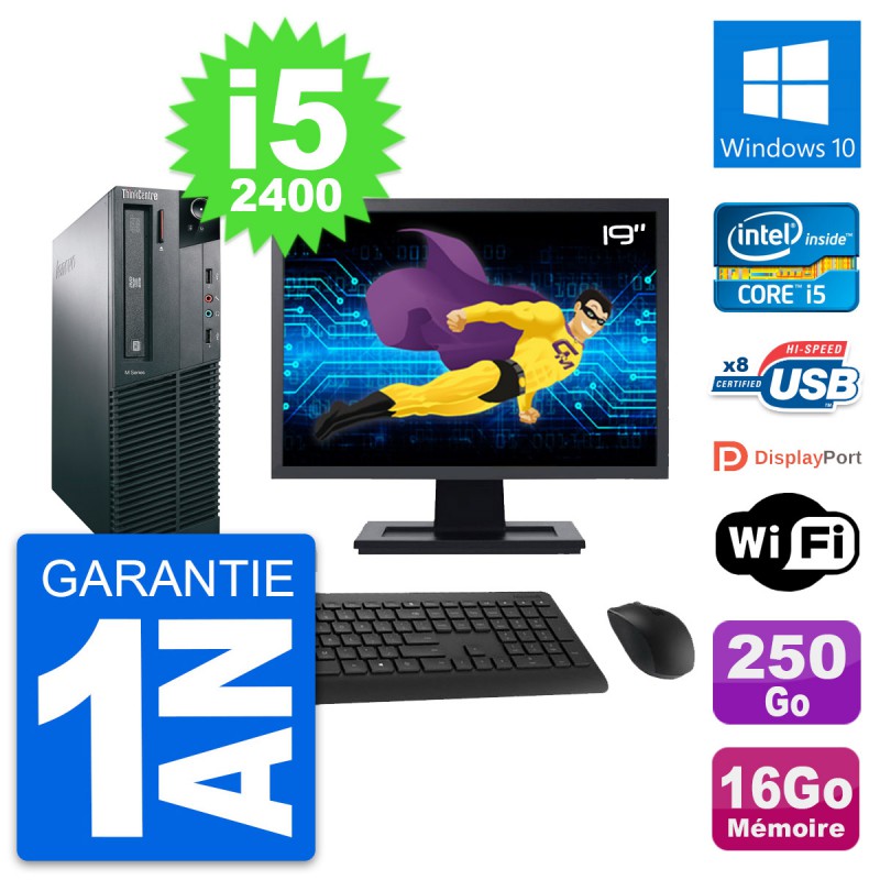 PC Lenovo M82 SFF - Intel Core i5-2400 3.1 Ghz (6 Mo) - 16 Go DDR3 - Disque Dur 3,5" 250 Go - Graveur DVD - Clef Wifi USB - Windows 10 - Livré avec Ecran 19" + clavier + souris (Marques et modèles variables) - Garantie 1 an.