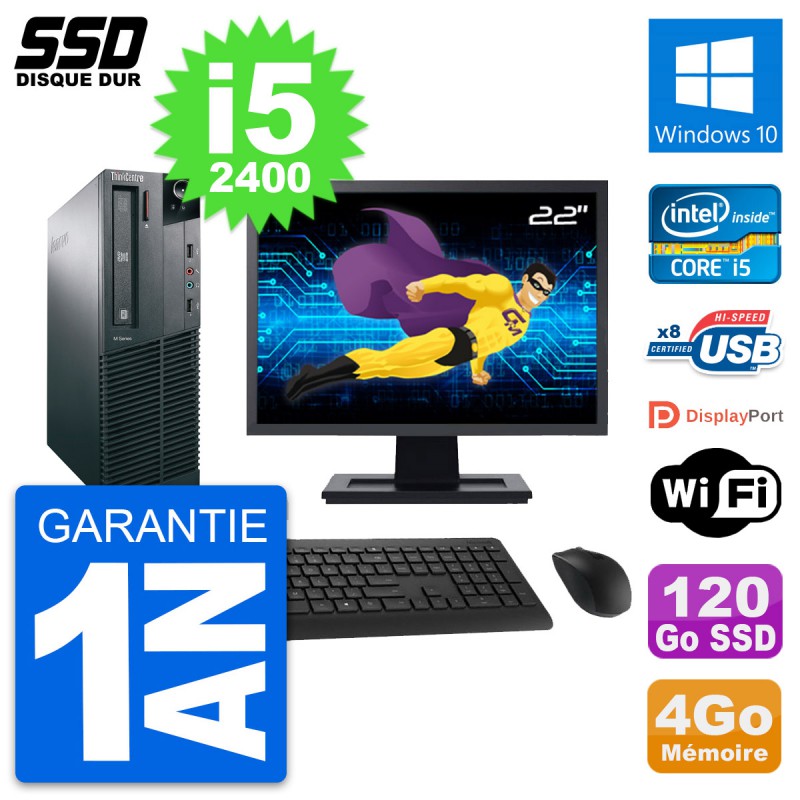 PC Lenovo M82 SFF - Intel Core i5-2400 3.1 Ghz (6 Mo) - 4 Go DDR3 - Disque Dur SSD 120 Go - Graveur DVD - Clef Wifi USB - Windows 10 - Livré avec Ecran 22" + clavier + souris (Marques et modèles variables) - Garantie 1 an.